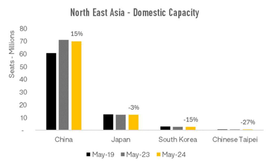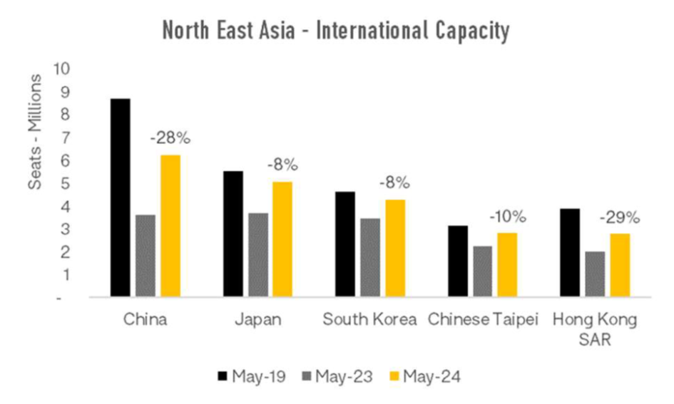 Internationally the picture is very different. China and Hong Kong SAR were still behind in May 2024 compared to May 2019 by a substantial 28% and 29% respectively. Japan and South Korea meanwhile reached more than 90% of the 2019 values in the same period according to OAG.