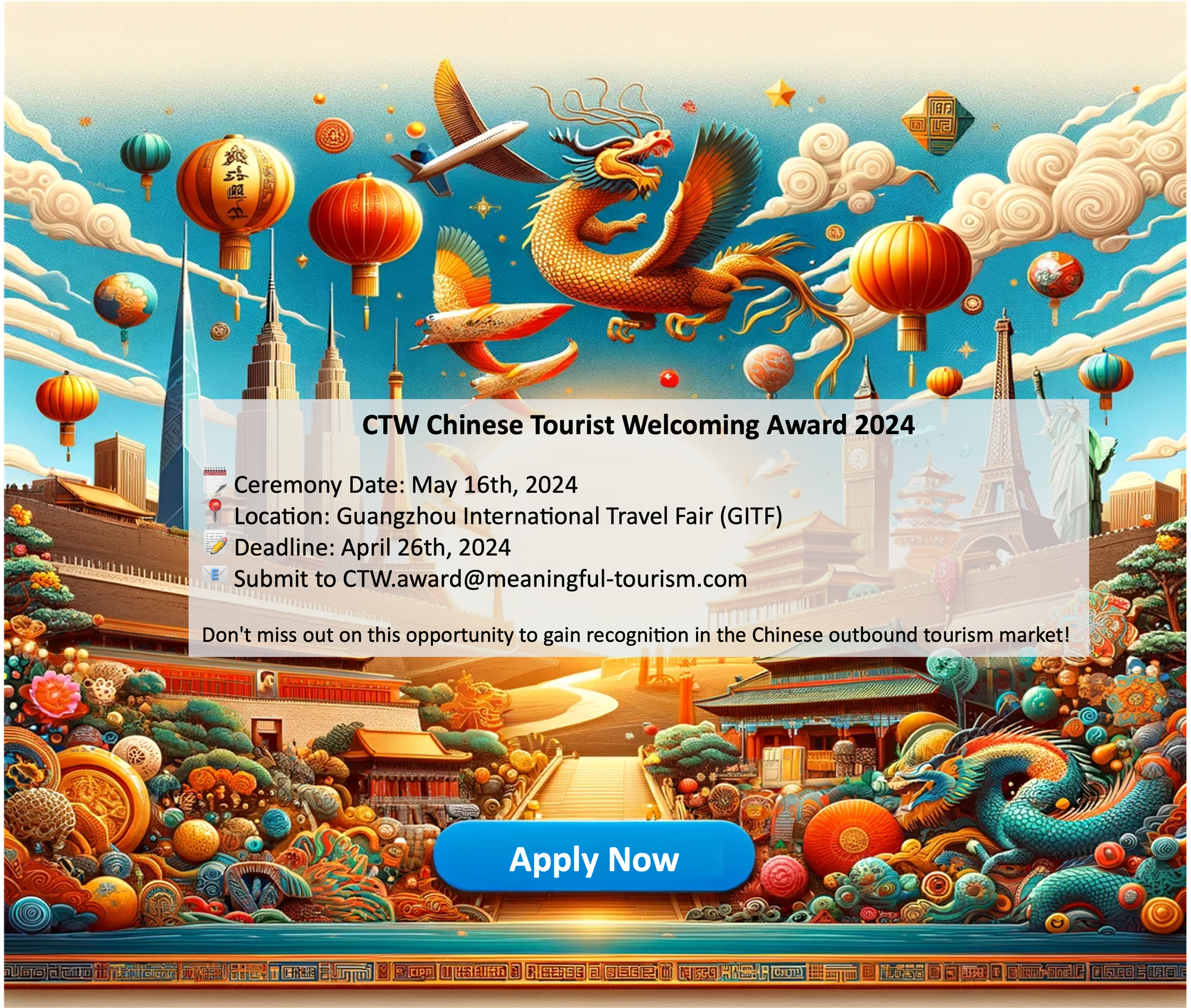 The 2024 CTW Award ceremony will be held on May 16th, 2024 during the Guangzhou International Travel Fair (GITF, May 16th to 18th, 2024). GITF is the oldest international tourism fair in China and the biggest in South China. This year, GITF is celebrating its 32nd anniversary and will include again a major international tourism conference organised by COTRI.