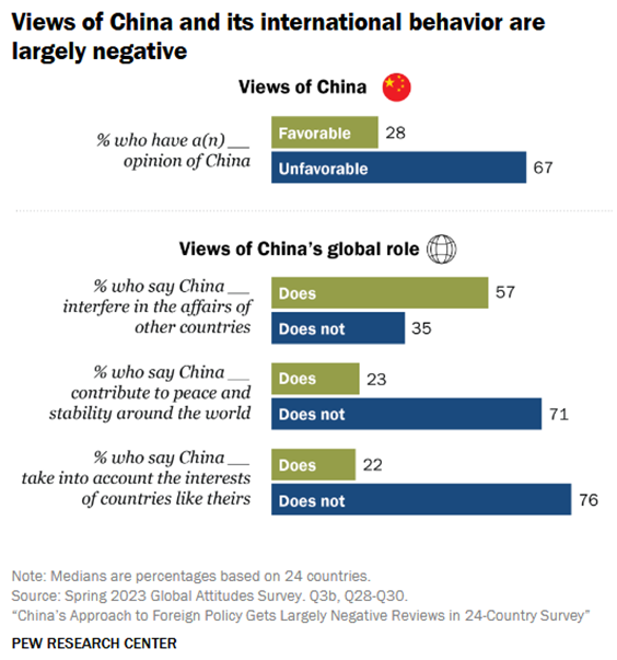 China is casted for the role of scapegoat in many of these discussions. In the decade under the leadership of Chairman Xi Jinping, the image of China in the world has shifted dramatically from being an example of success as a result of diligence and intelligence towards an image of being a dangerous bully. A recent study of the Pew Research Center in 24 countries reported the worst-ever results in 2023 for the majority of the countries (see graph). Another study of 2022 by Joshua Kurlantzick even spoke of the “collapse of China’s Soft Power”.
